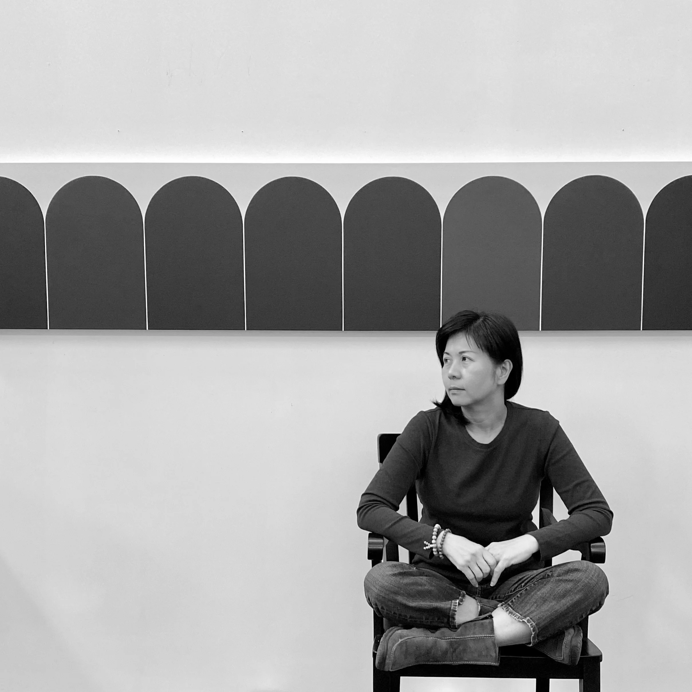 Yi's paintings portray static, abstracted images of urban landscapes through the use of hard-edged lines, minimalist compositions, symbolic figures, and balanced colors. Through color and composition, her visual language defers abstract qualities around the serene. Balance, weight, and time are associated with a universal visual language that reflects an autonomous state.